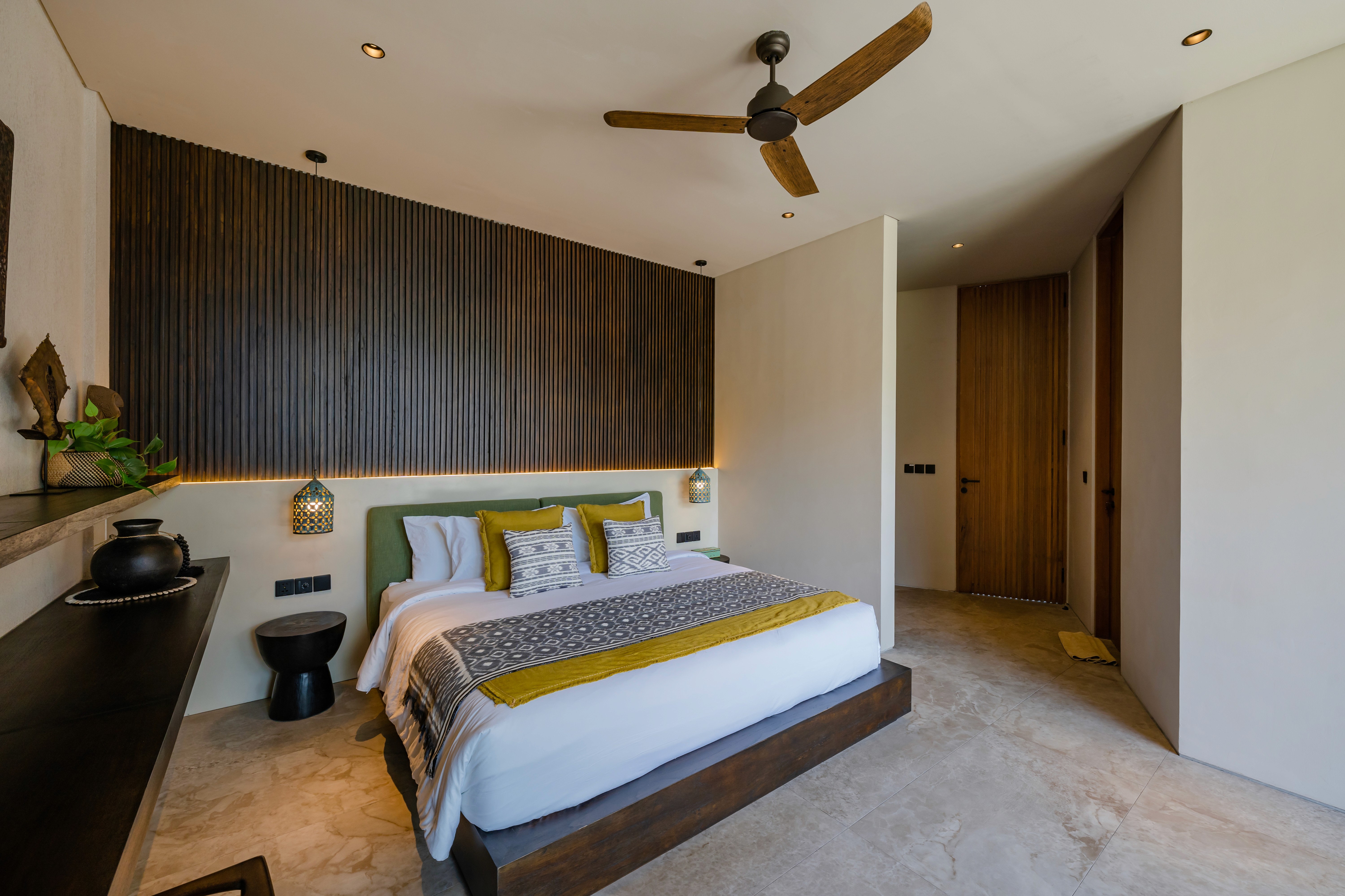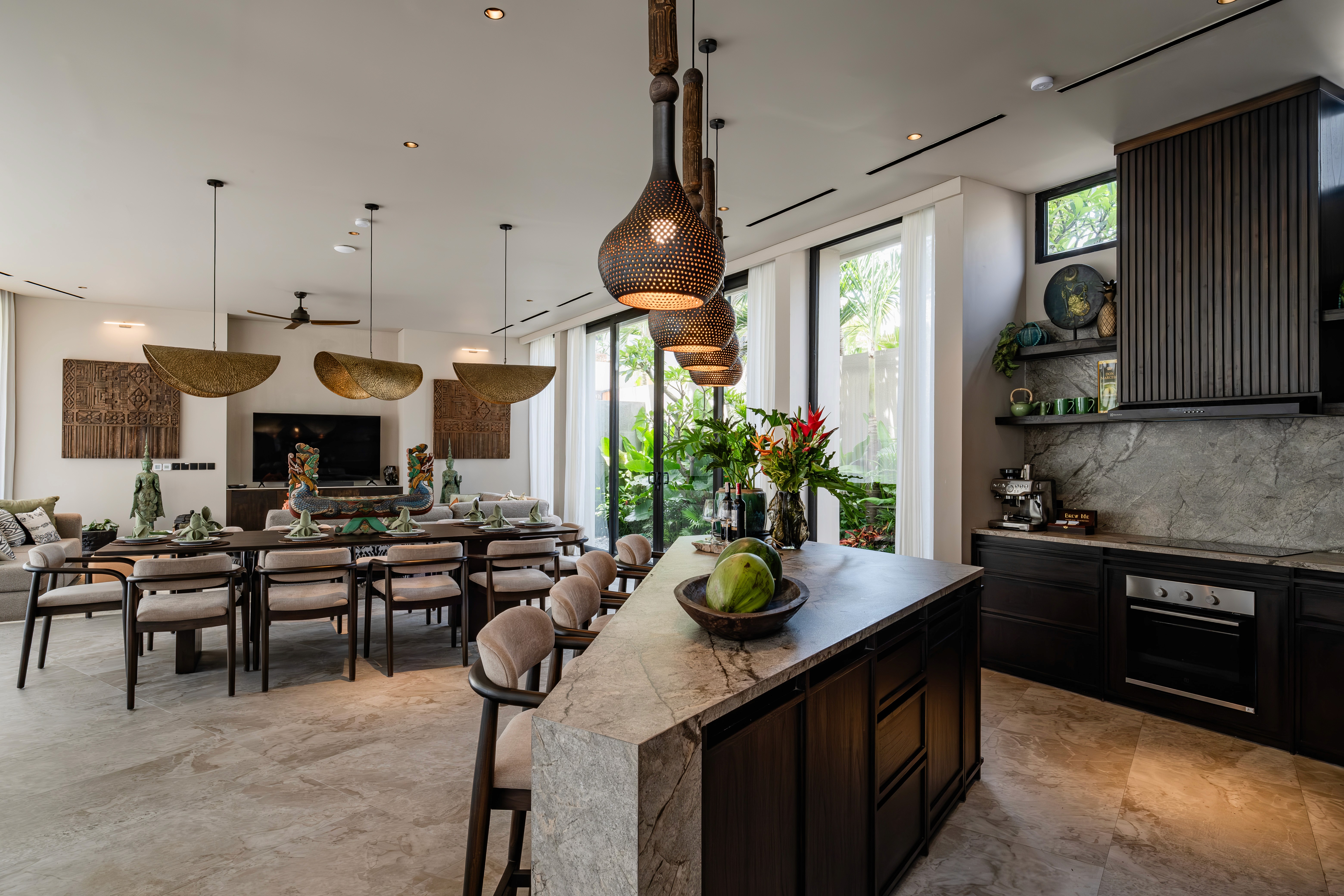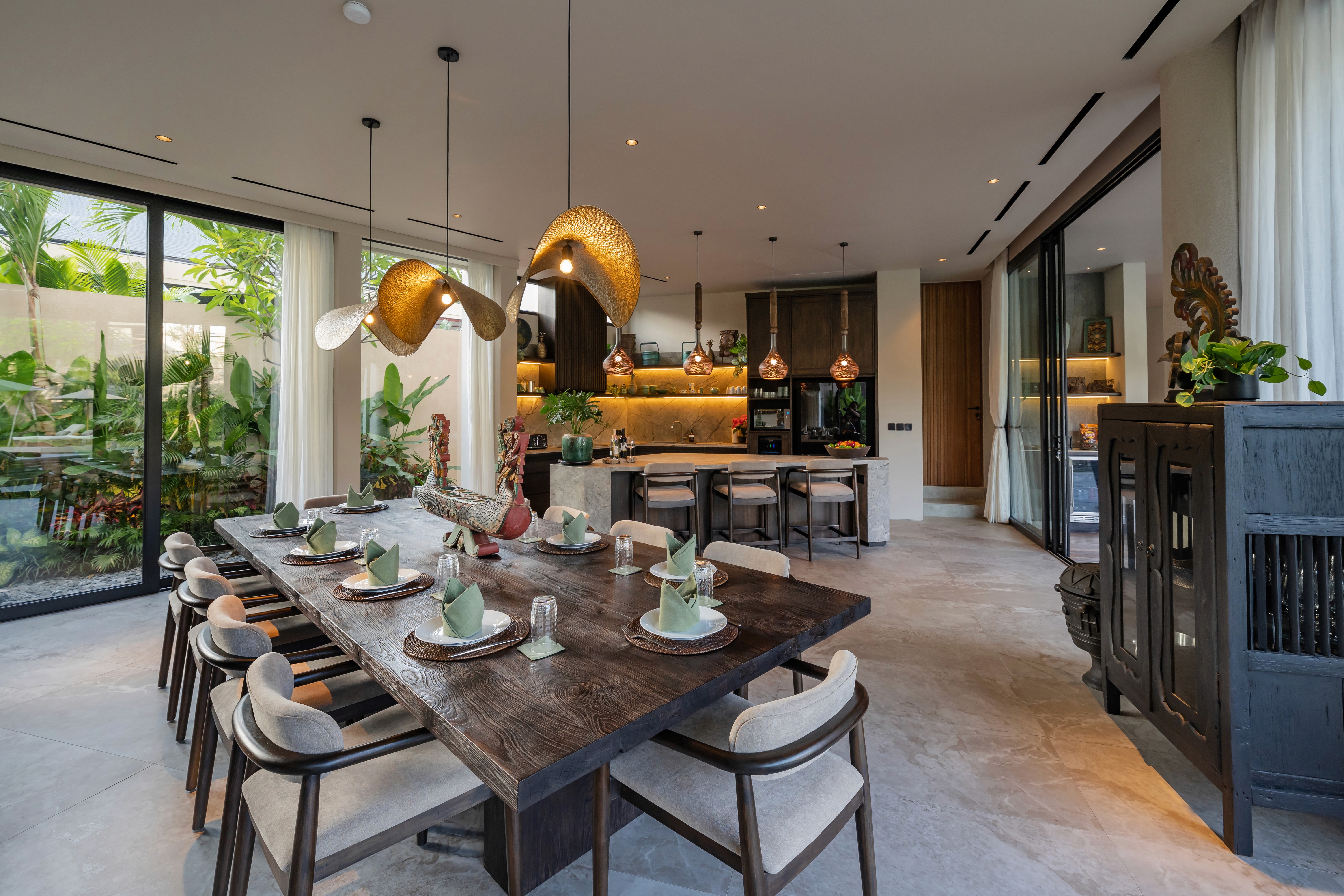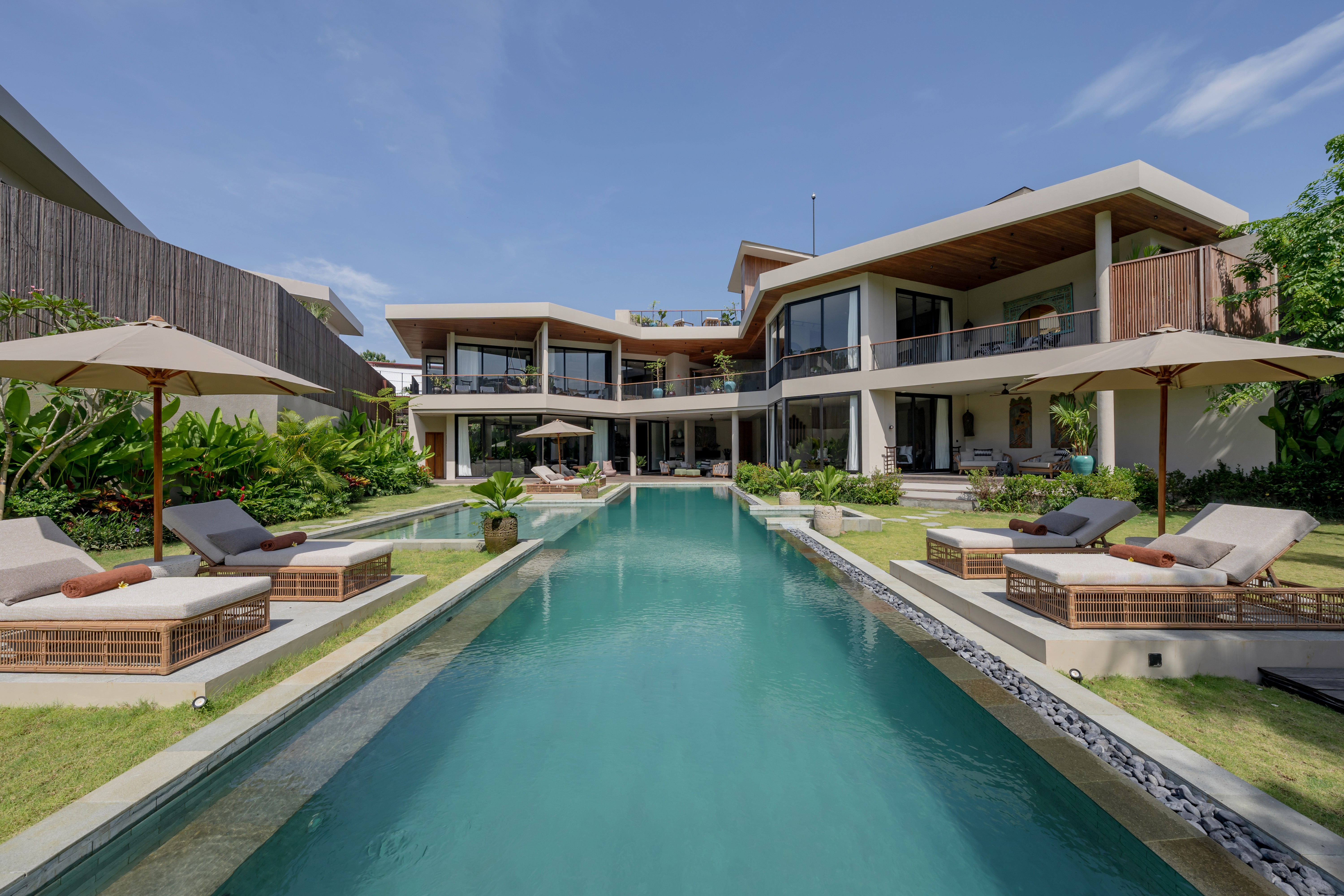 Five bedrooms across three levels. Two master suites. Two fully equipped kitchens because one isn't enough when you're hosting twelve people. Butler service. A media room. Five private terraces including a rooftop level for sunset cocktails. The 20-meter lap pool cuts through the garden. A separate plunge pool for kids and grandparents. Space so expansive that even with everyone here, you'll find moments alone. This is the villa we designed for when everyone comes. Big families. Friend groups. Milestone celebrations. Weddings. The occasions that need the flagship.