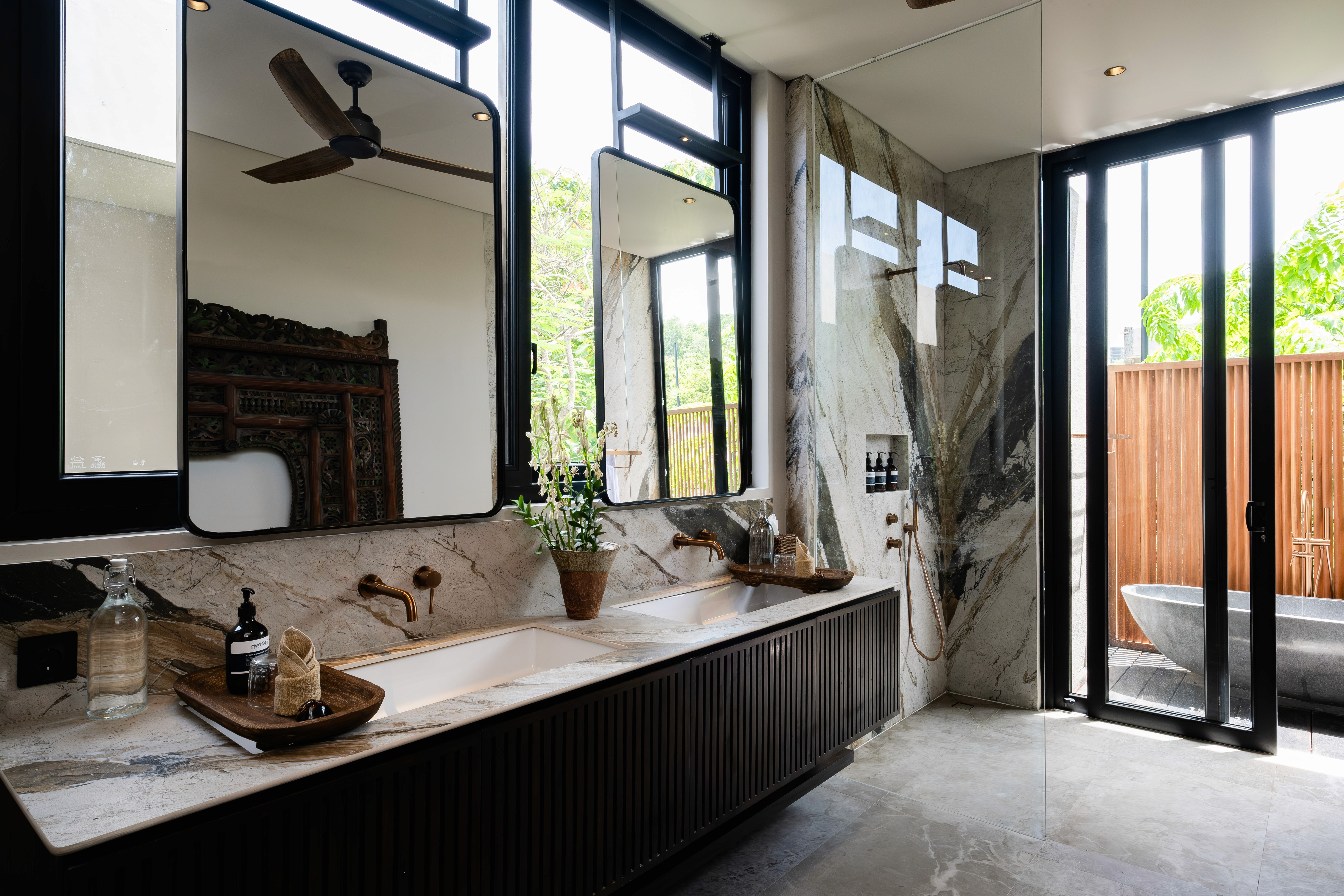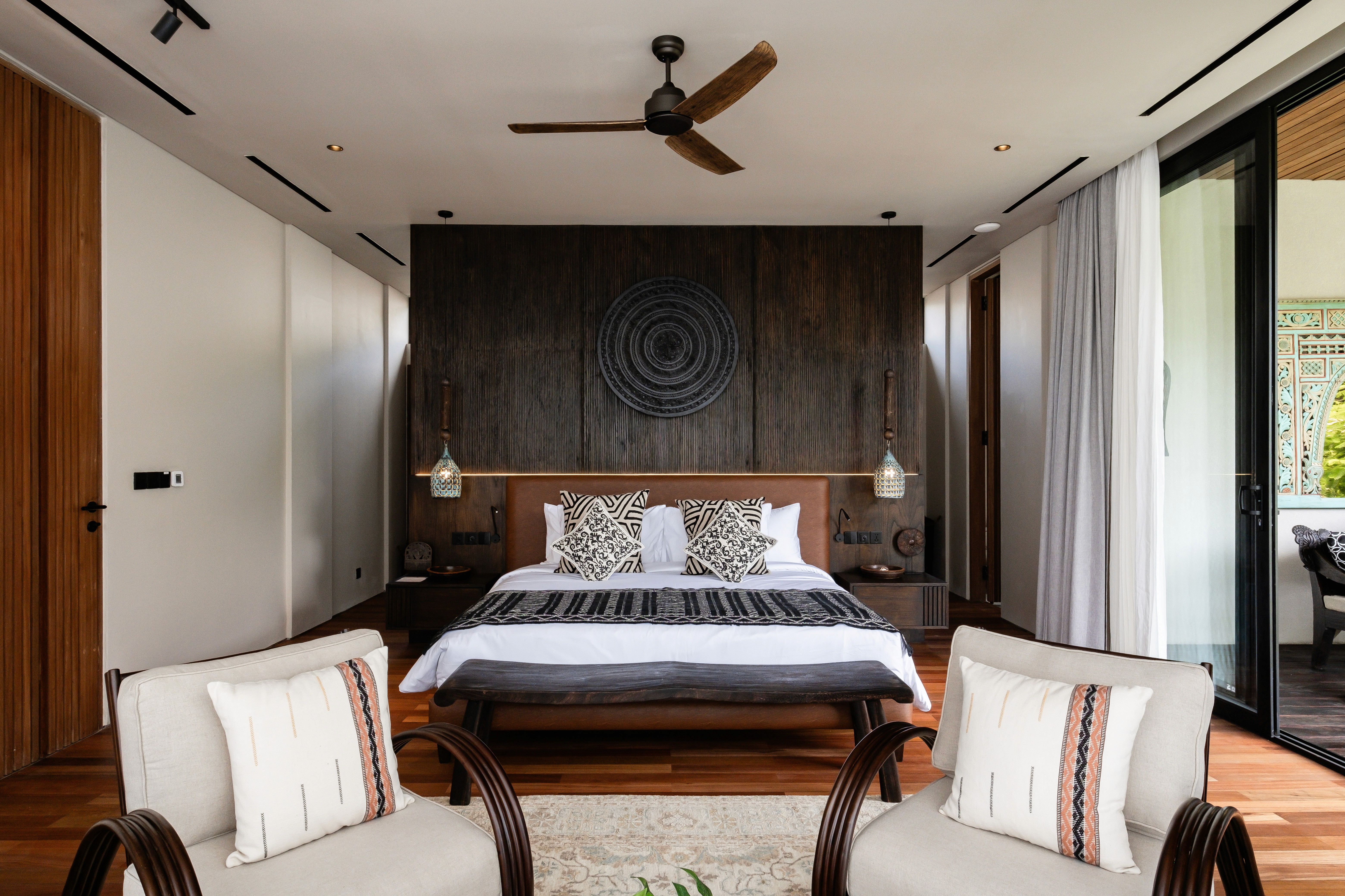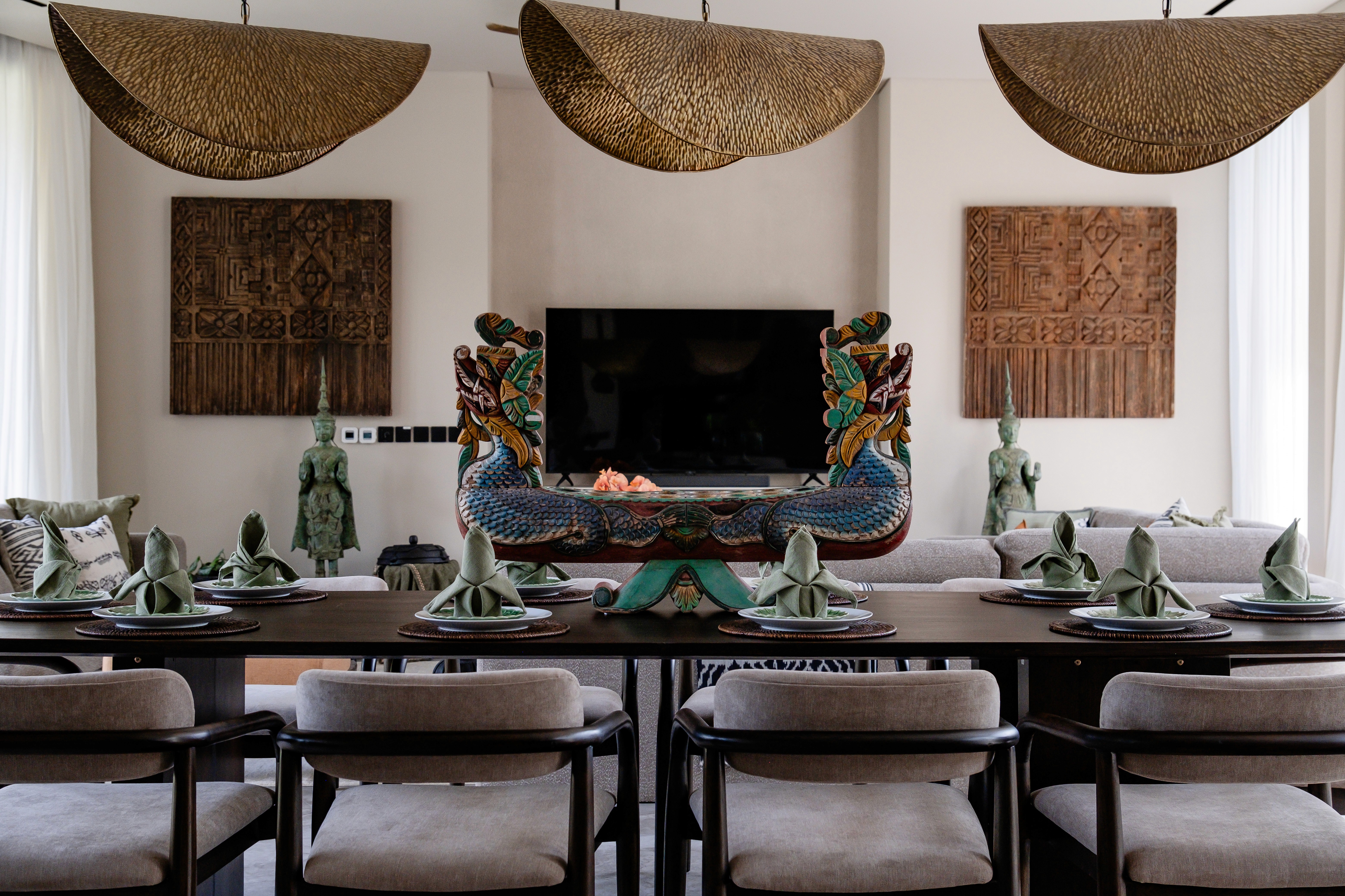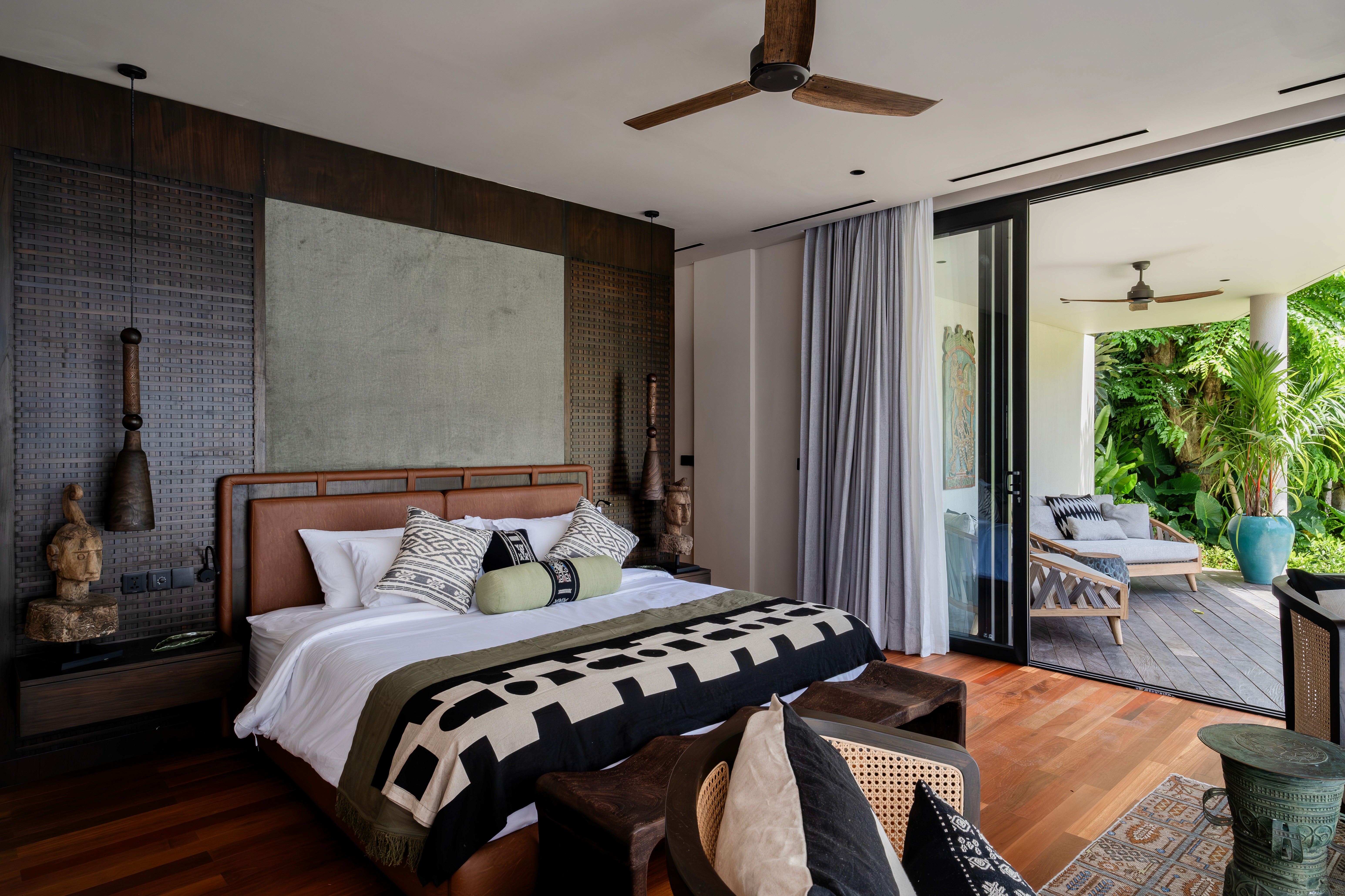 Five bedrooms across three levels. Two master suites. Two fully equipped kitchens because one isn't enough when you're hosting twelve people. Butler service. A media room. Five private terraces including a rooftop level for sunset cocktails. The 20-meter lap pool cuts through the garden. A separate plunge pool for kids and grandparents. Space so expansive that even with everyone here, you'll find moments alone. This is the villa we designed for when everyone comes. Big families. Friend groups. Milestone celebrations. Weddings. The occasions that need the flagship.