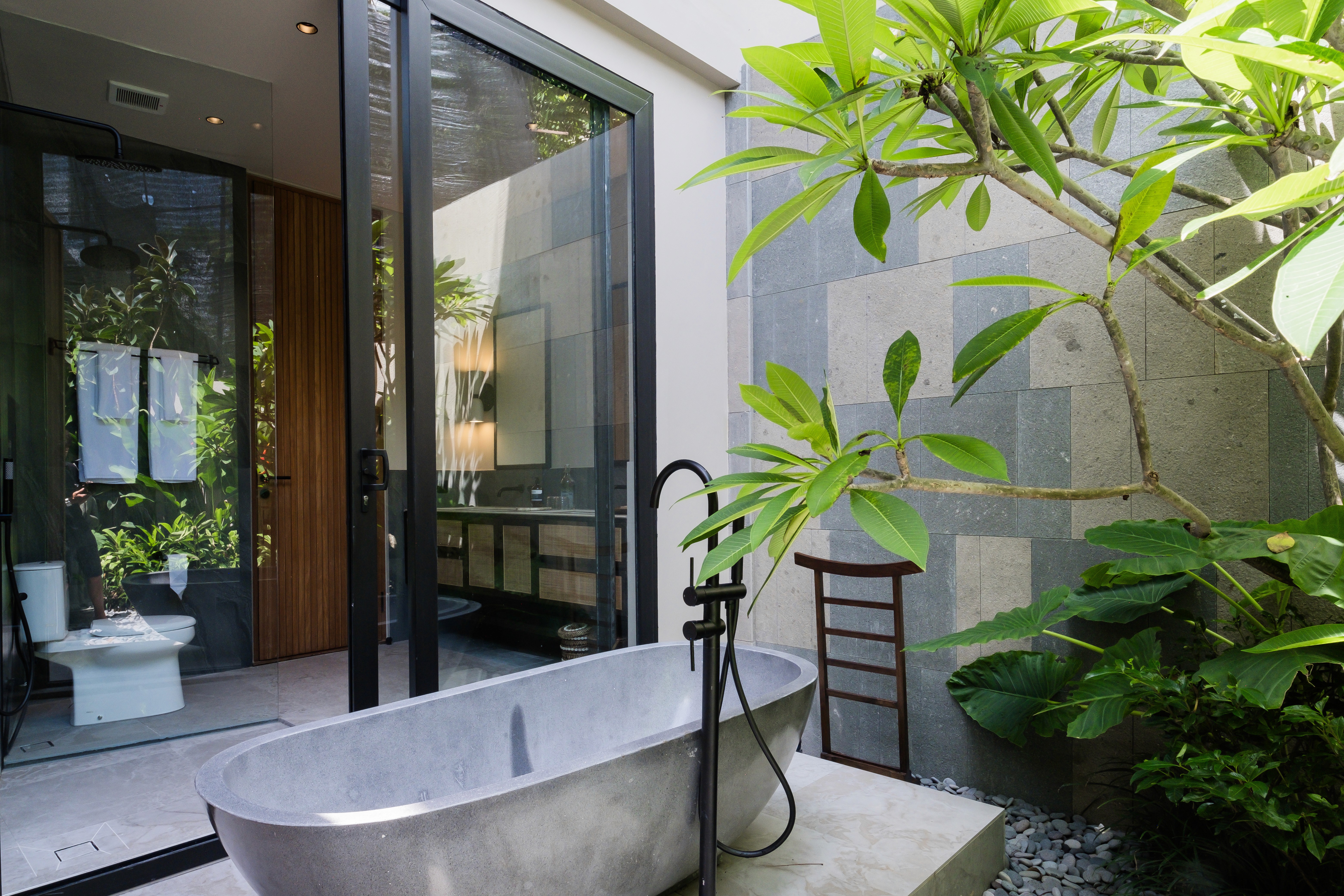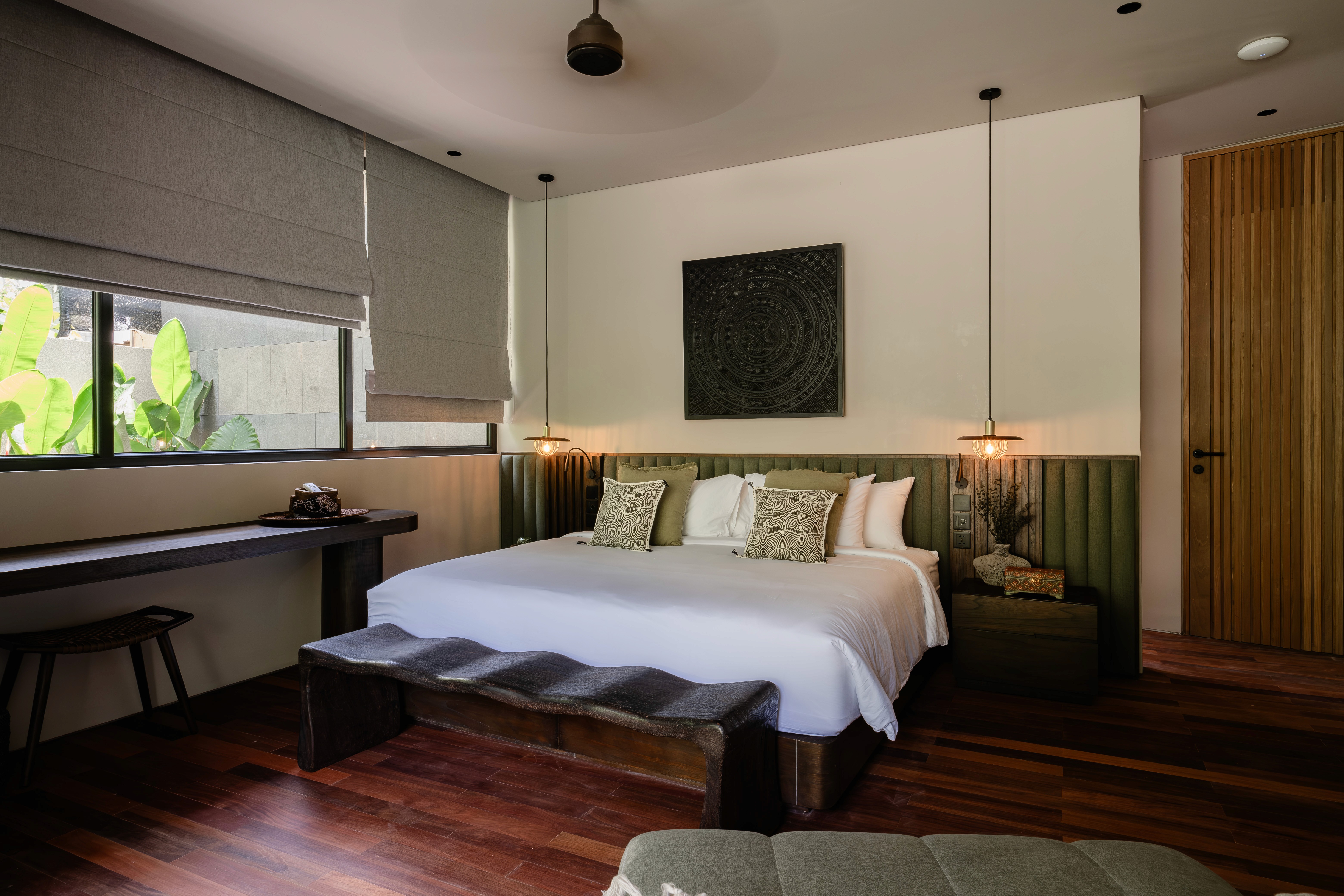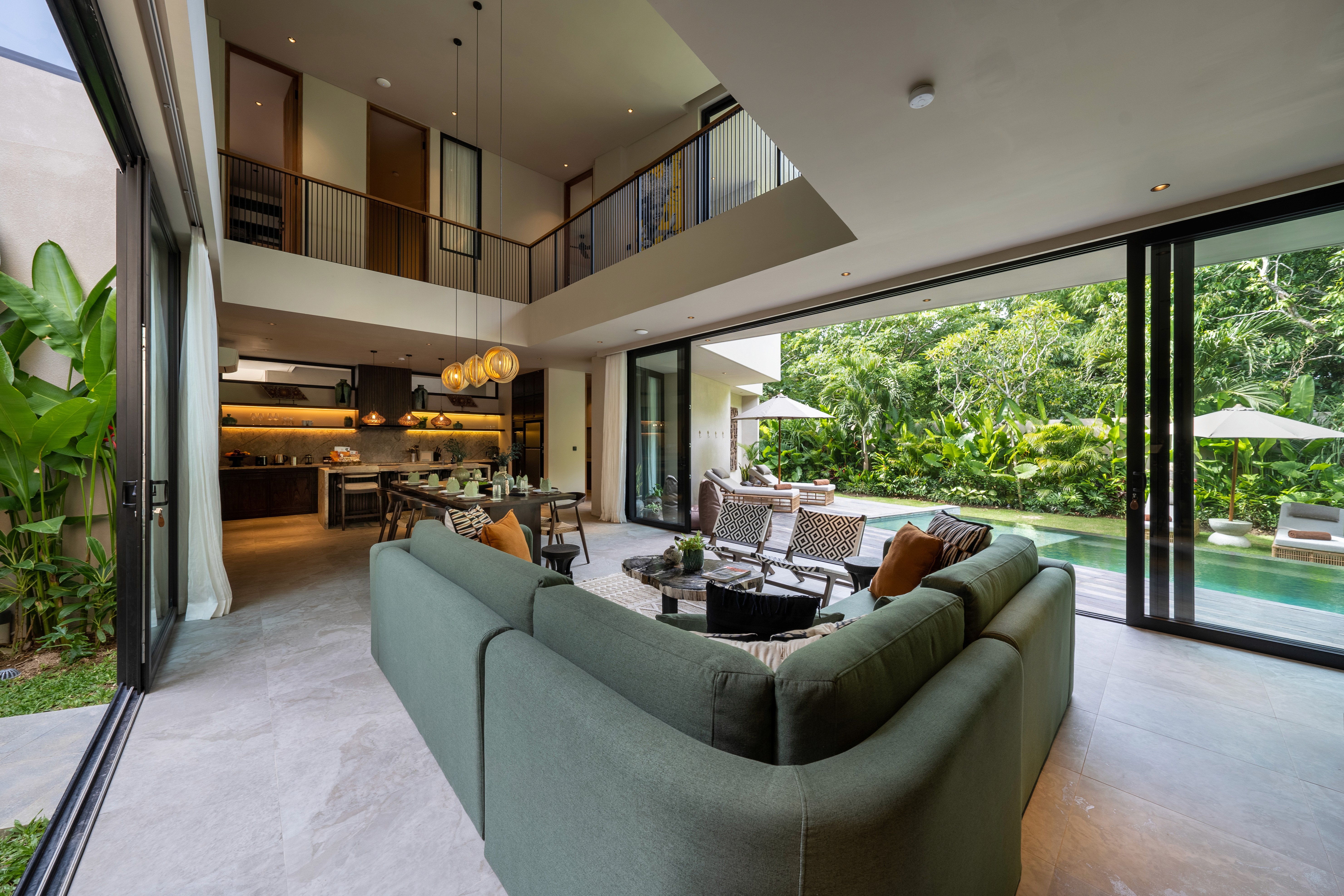 Four bedrooms. Two master suites. Butler service. A media room for when the group wants to disappear together. The villa designed for modern gatherings where some people claim the pool while others find quiet corners. Multiple living areas. A pool for lounging and socialising. Spaces that adapt to how you actually want to spend your days. Surrounded by a lush garden that wraps around every side. You didn't come to Bali to stare at concrete.