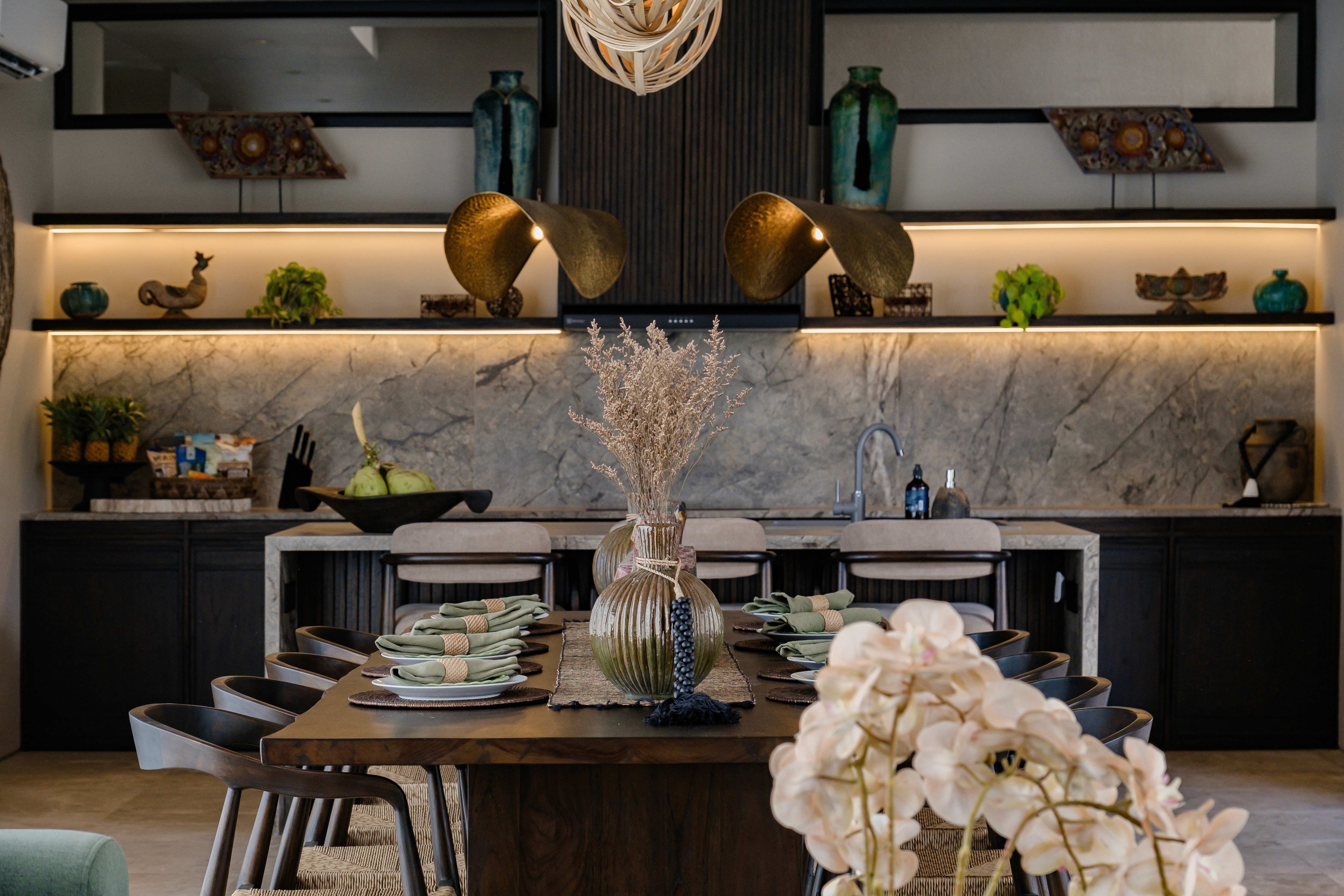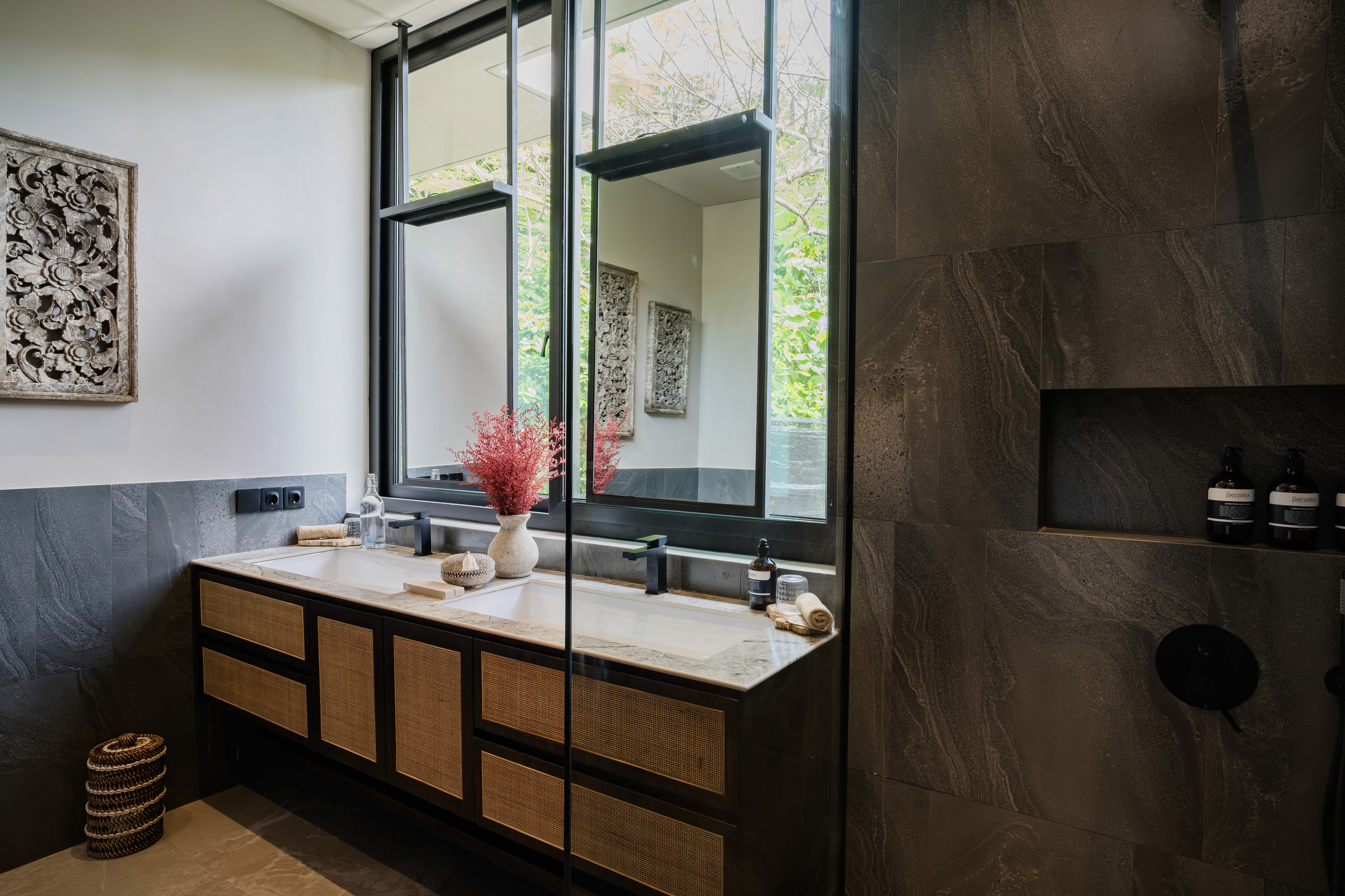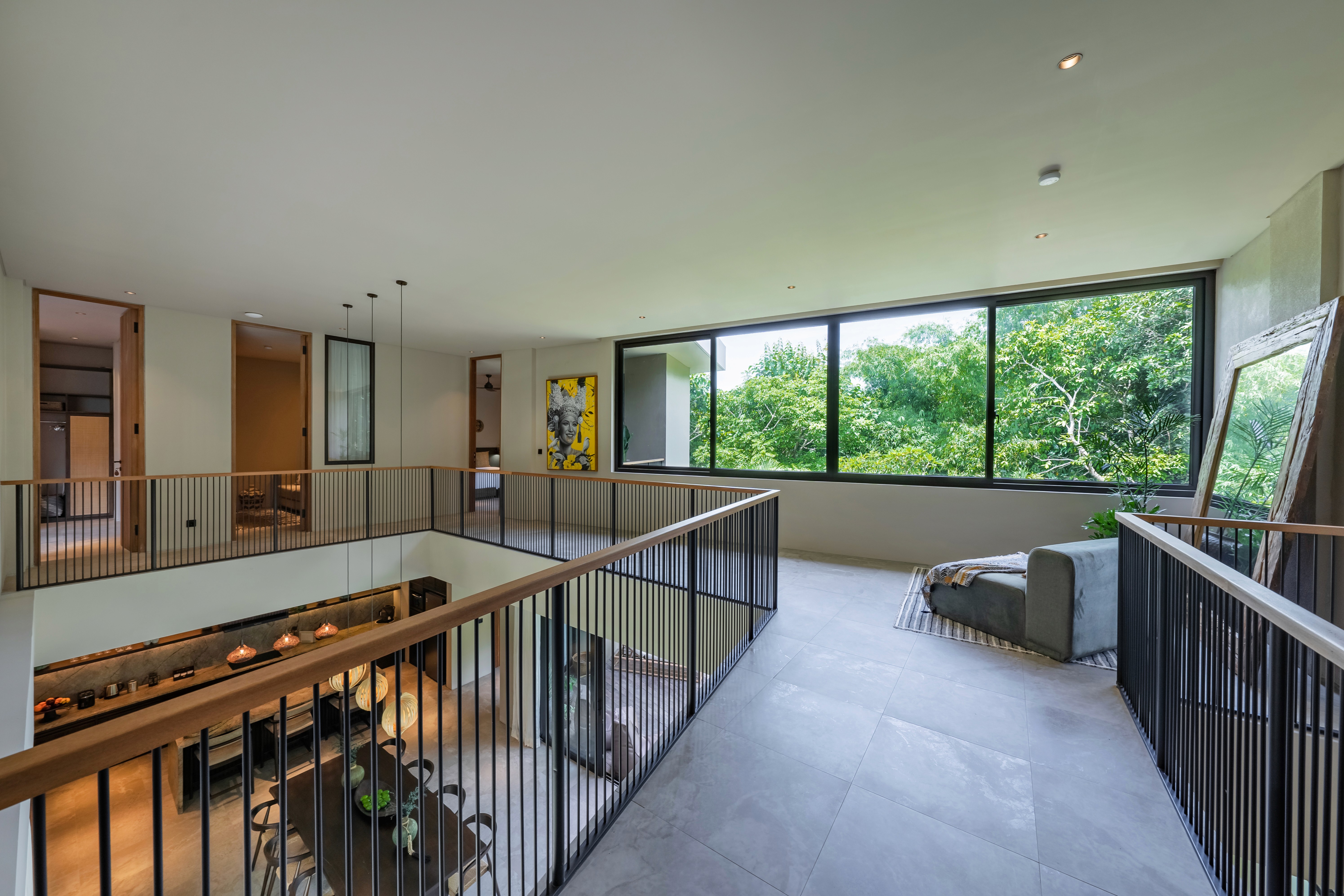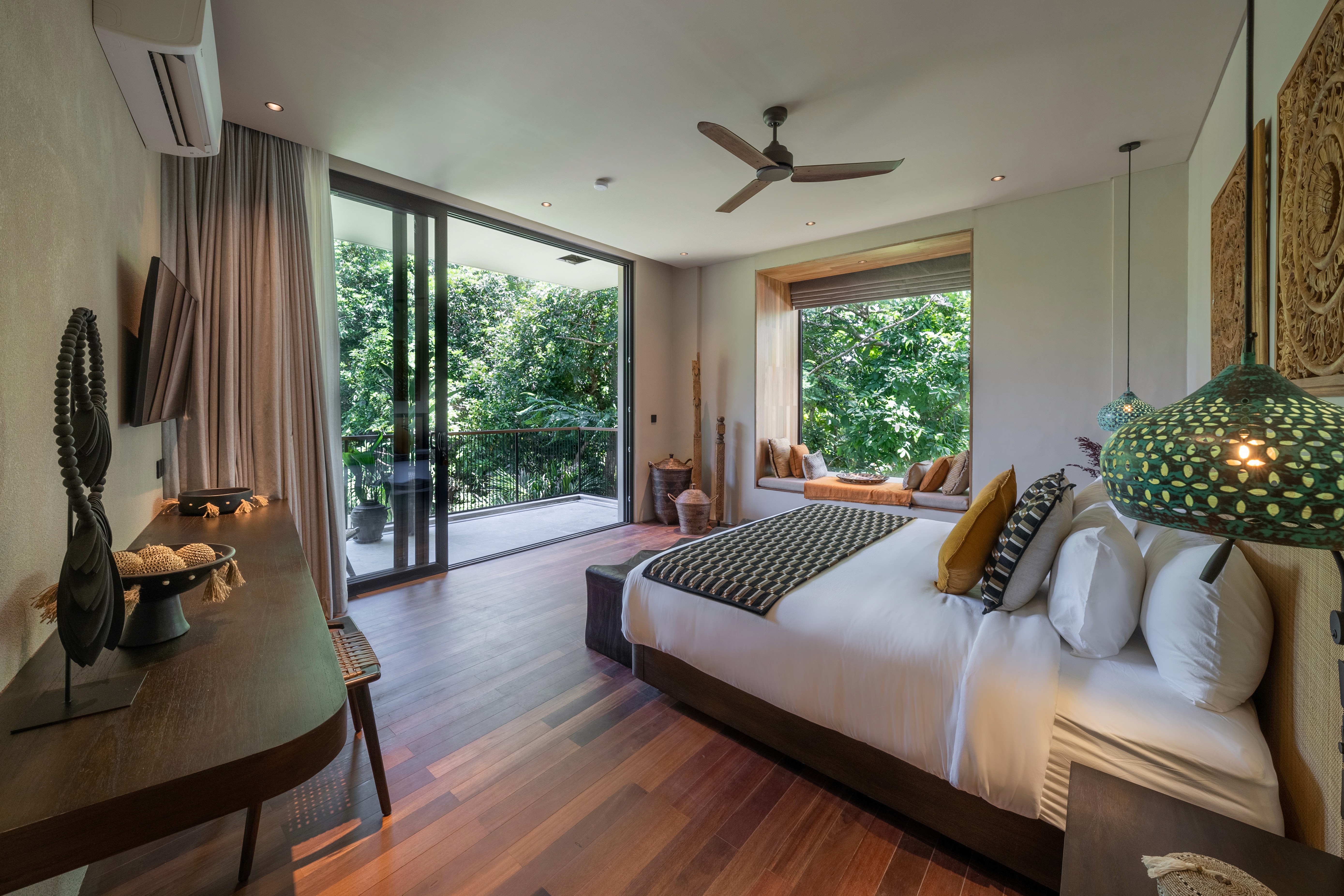 Four bedrooms. Two master suites. Butler service. A media room for when the group wants to disappear together. The villa designed for modern gatherings where some people claim the pool while others find quiet corners. Multiple living areas. A pool for lounging and socialising. Spaces that adapt to how you actually want to spend your days. Surrounded by a lush garden that wraps around every side. You didn't come to Bali to stare at concrete.
